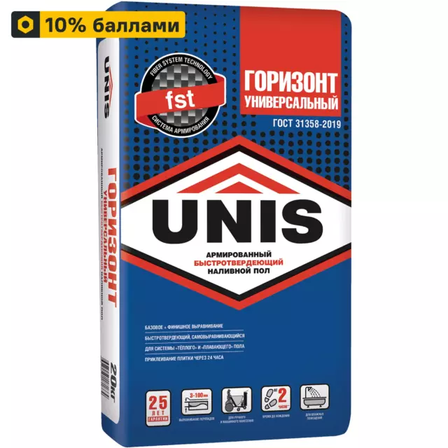 Дополнительно усилен армирующими волокнами, что снижает риск образования трещин и усадки наливного пола.
